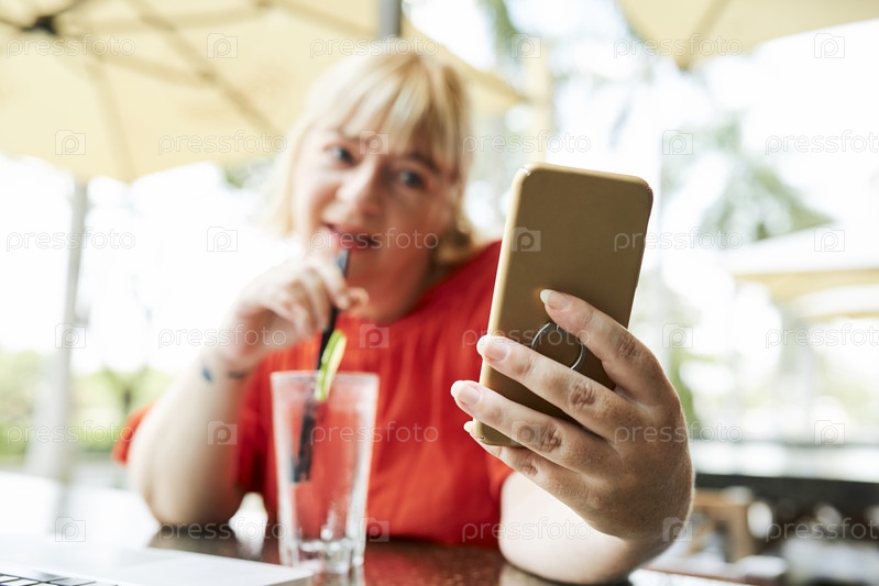 Женщина фотографирует в открытом кафе