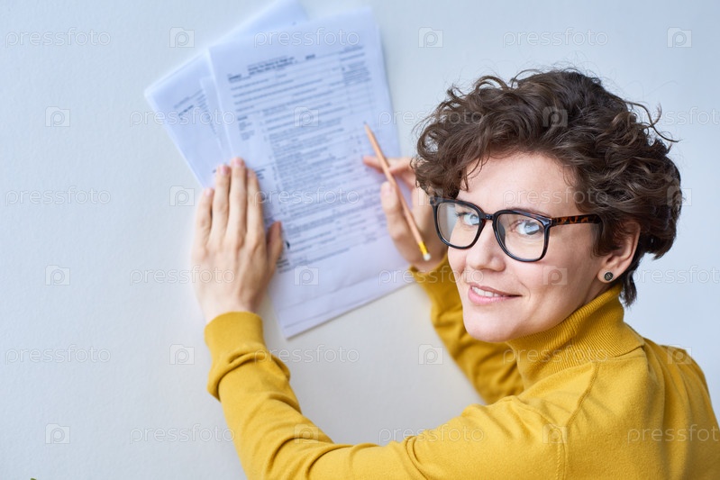Удовлетворенная женщина получает налоговую декларацию