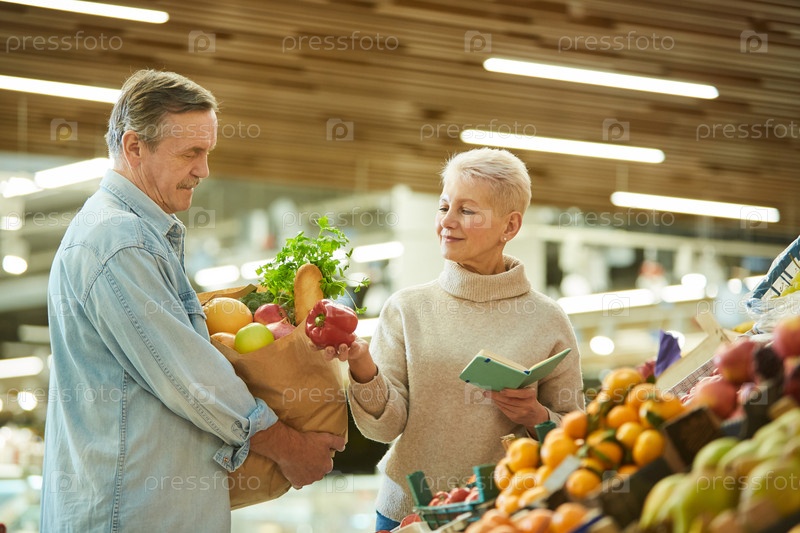 Улыбающаяся старшая пара покупает продукты на рынке