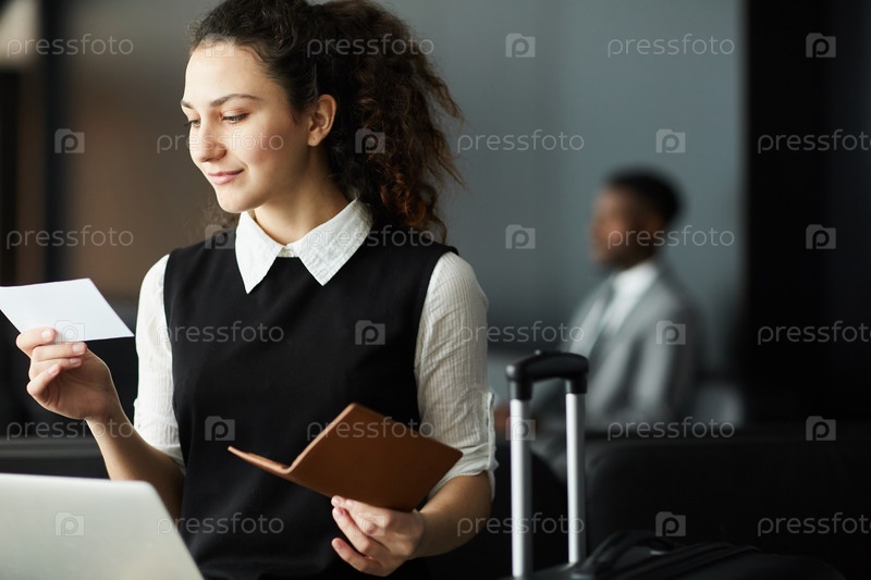 Путешествующая деловая женщина с билетом и паспортом