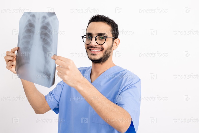 Успешный рентгенолог в синей форме держит перед собой рентгеновское изображение