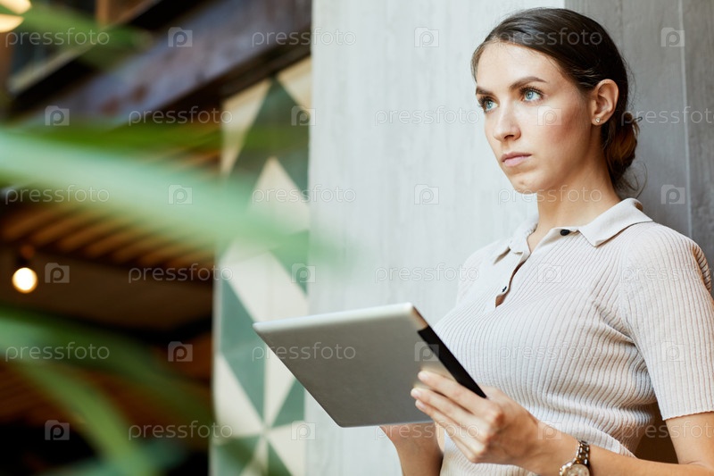 Серьезная целенаправленная молодая брюнетка стоит у стены и использует цифровое устройство во время планирования нового проекта