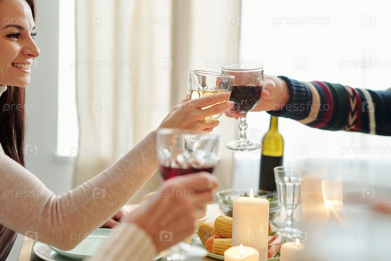Счастливая молодая женщина и ее отец, колочущие со стаканами вина за подаваемым столом