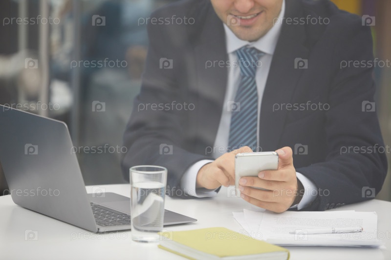 Бизнесмен использует смартфон на рабочем месте