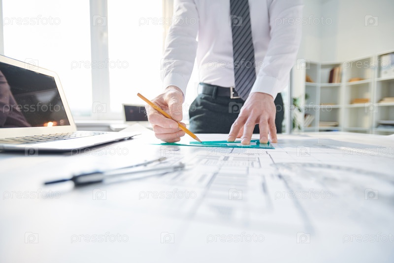 Близкий план неузнаваемого инженера в формальной рубашке, использующего линейку треугольника во время составления эскиза оборудования