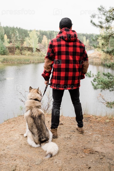 Молодой человек в повседневной одежде держит повод своего питомца, пока оба смотрят на озеро