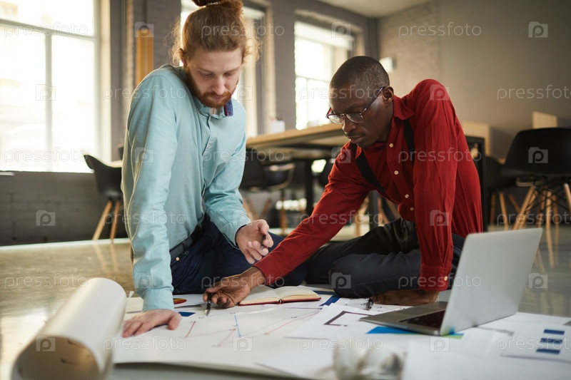 Работающие бизнесмены сидят на полу