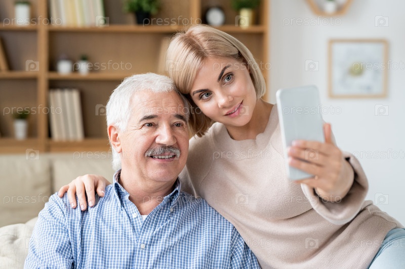 Молодая ласковая блондинка обнимает своего престарелого отца, делая селфи