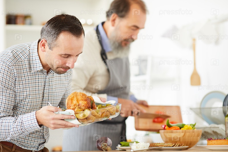 Молодой человек готовит индейку на ужин