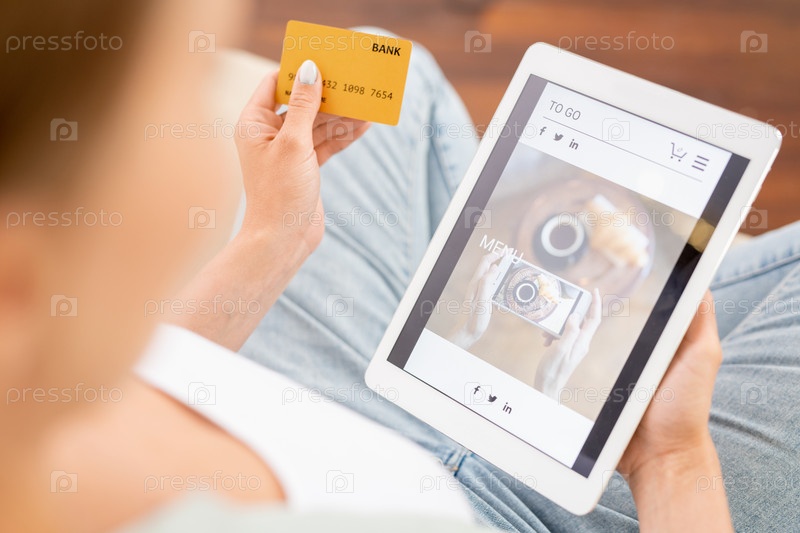 Современный потребитель с пластиковой картой и планшетом смотрит через товары онлайн