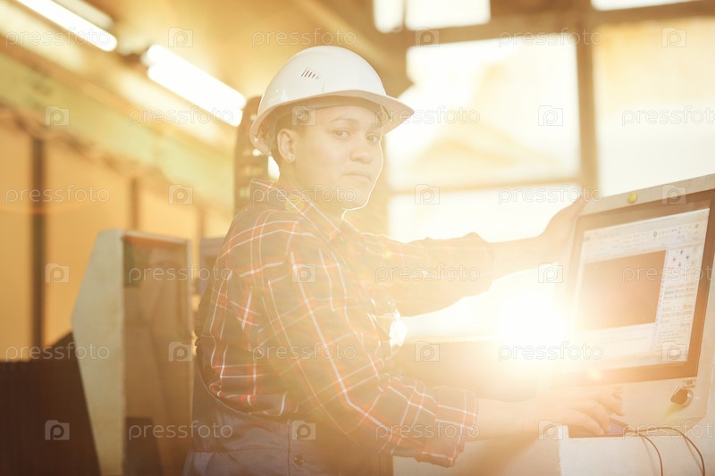 Портрет женщины-работницы, работающей на машинах в солнечном свете