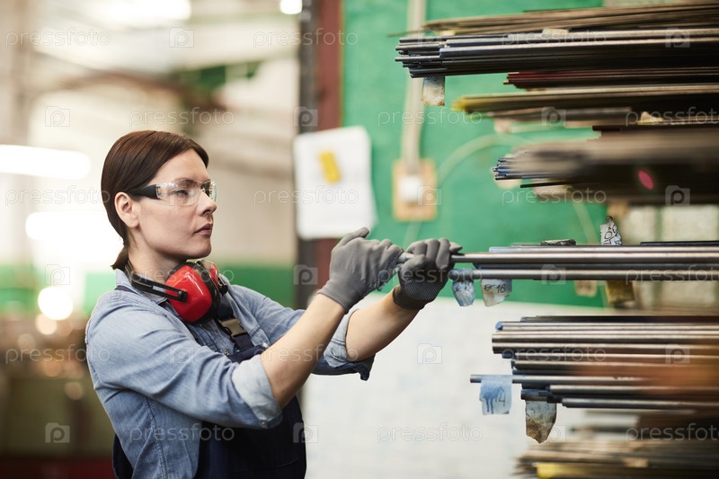 Серьезно сконцентрированная молодая брюнетка-работница промышленного завода в рабочих перчатках, выбирающая металлическую палку для обработки