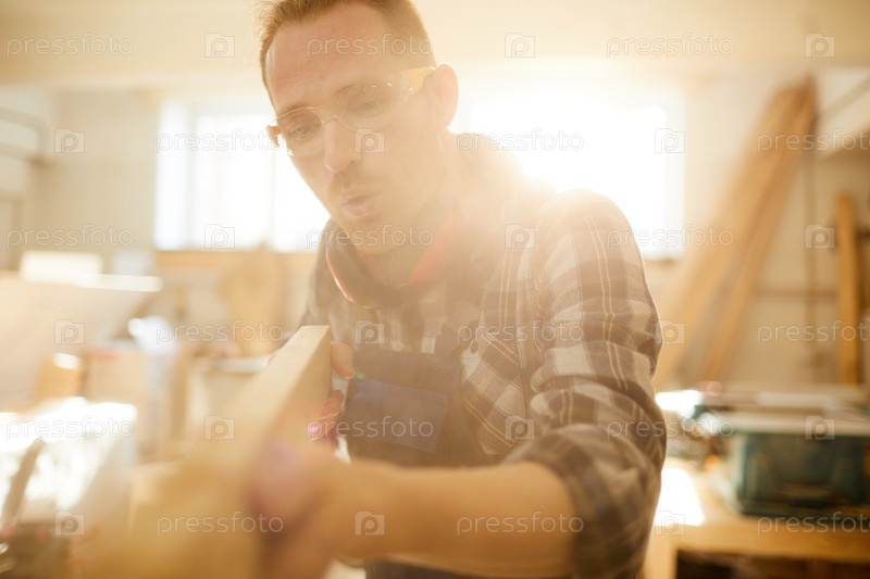 Плотник, дующий пиломатериал