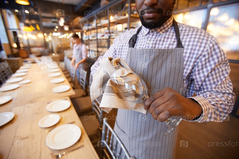 Официант чистит кристаллические очки для банкета