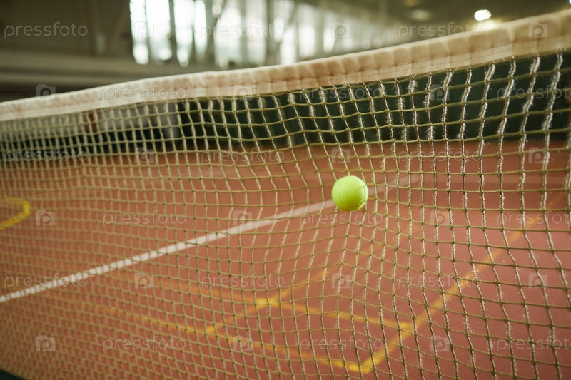 Близкий план зеленого теннисного мяча, ударяющего по сетке, считающейся наружу на крытой площадке, фон игры в теннис