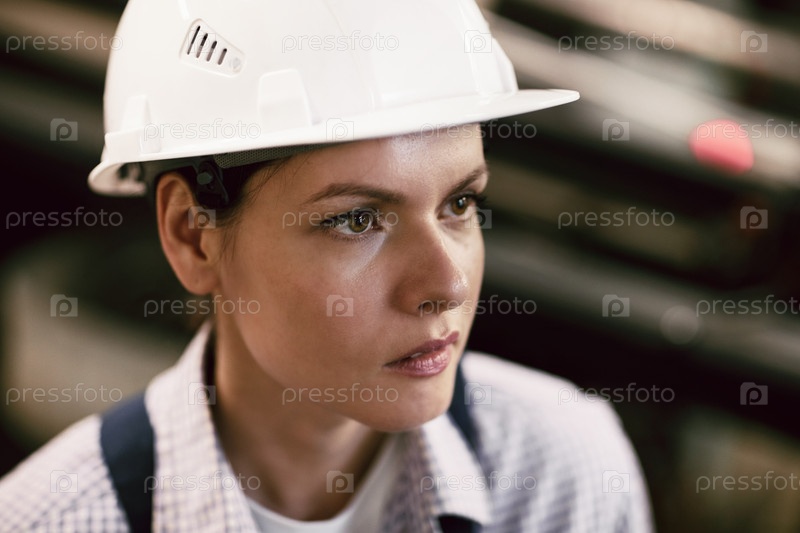 Близкий план серьезной жестокой молодой женщины в жестком шляпе, работающей на фабрике, рассматривающей промышленные процессы