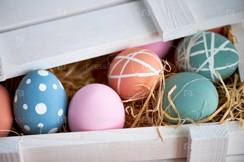 Яркие красочные пасхальные яйца в пастельных цветах помещаются в сена