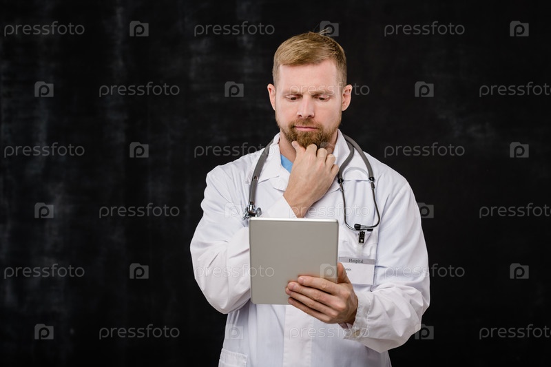 Вдумчивый молодой врач с фонендоскопом на шее просматривает онлайн-данные