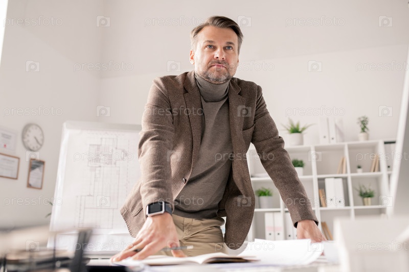 Вдумчивый зрелый архитектор, опирающийся на стол с документами во время планирования работы