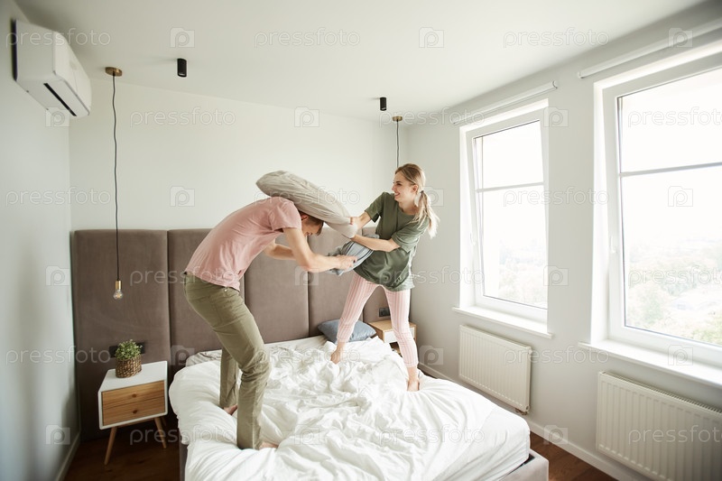 Молодая игривая пара бьет друг друга подушками