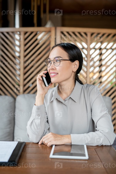Молодая улыбающаяся агентка с мобильным телефоном консультирует одного из клиентов
