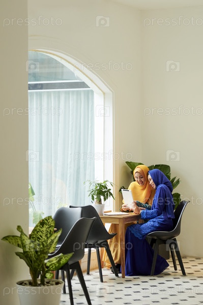 Красивые мусульманские женщины с цифровым планшетом