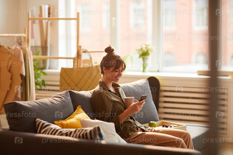 Счастливая красивая девушка с брюнетками и булочкой для волос сидит на удобном диване с подносом и прокручивает социальные сети на гаджете