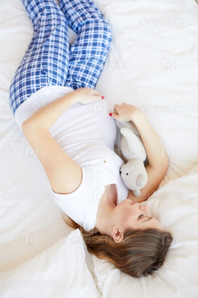 Беременная женщина спит в постели Top View