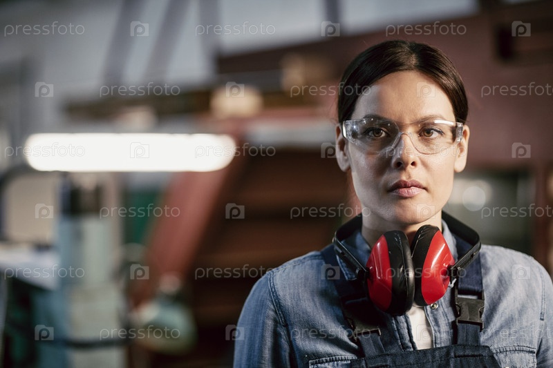 Портрет серьезной грубой брюнетки средних лет в очках безопасности и защитных ушах, работающей на промышленном заводе