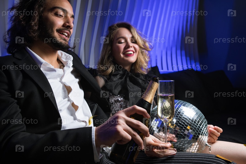 Счастливый молодой человек с бутылкой шампанского собирается налить вино на флейту