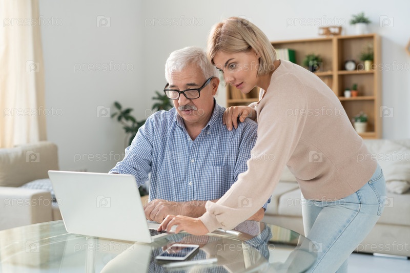 Молодая женщина в повседневной одежде и ее старший отец смотрят на дисплей ноутбука