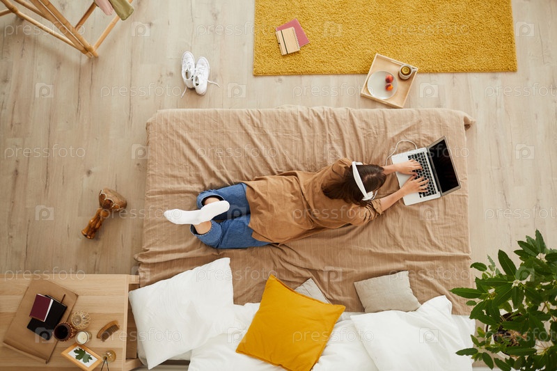 Вид под высоким углом молодой женщины в наушниках, лежащей в постели и печатающей на ноутбуке во время работы над исследованием