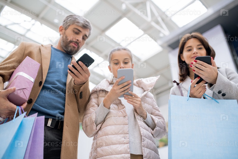 Семья шопоголиков, ищущих сезонные скидки в интернет-магазинах