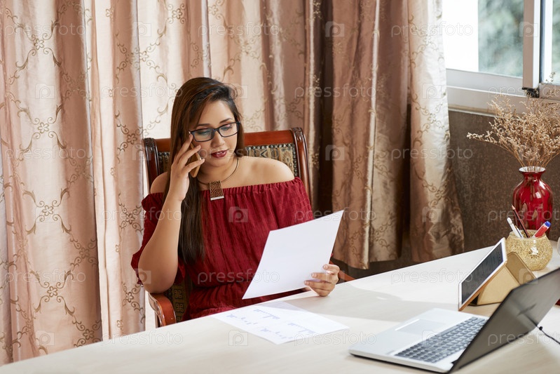 Деловая женщина обсуждает документ по телефону