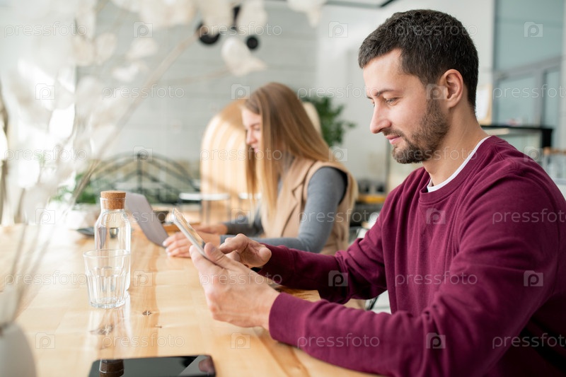 Современный молодой человек прокручивает цифровой планшет, отдыхая в кафе
