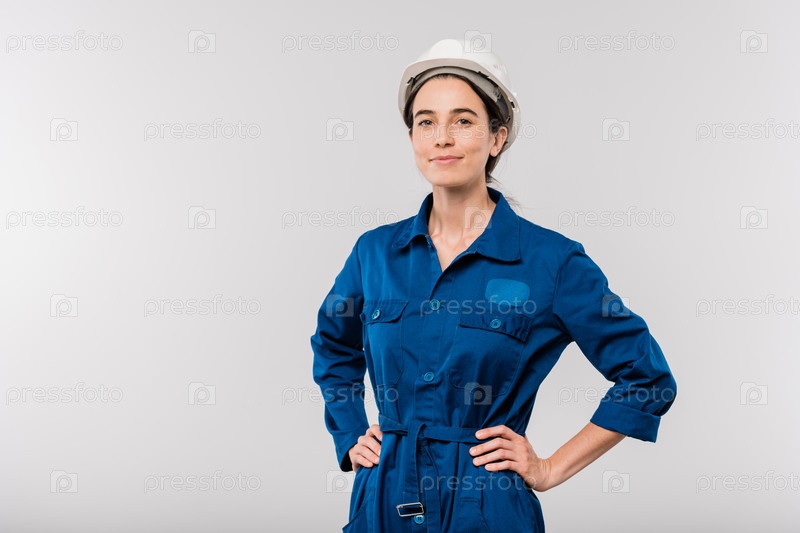 Довольно молодая успешная женщина-инженер в синей рабочей одежде и шлеме безопасности