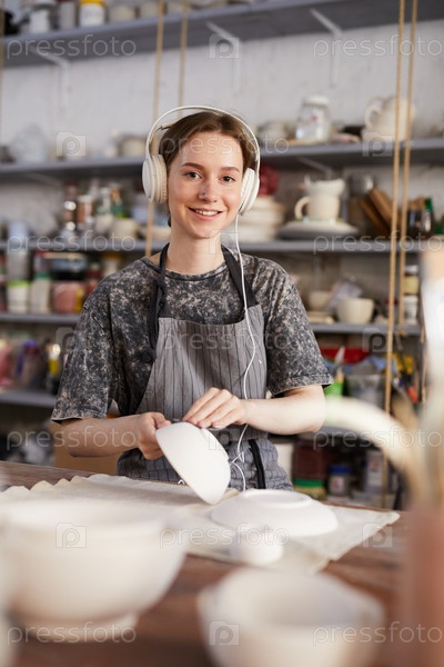 Счастливый гончар проверяет посуду в мастерской