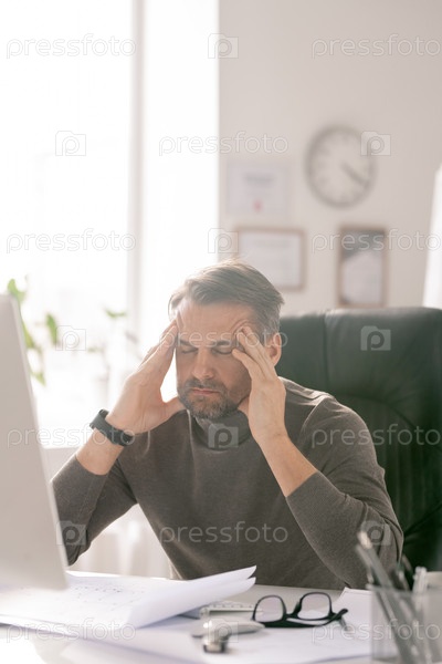 Зрелый уставший бизнесмен с закрытыми глазами, пытающийся сконцентрироваться на работе