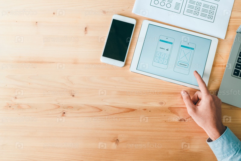 Обзор человеческой руки, указывающей на новое приложение программного обеспечения для смартфонов