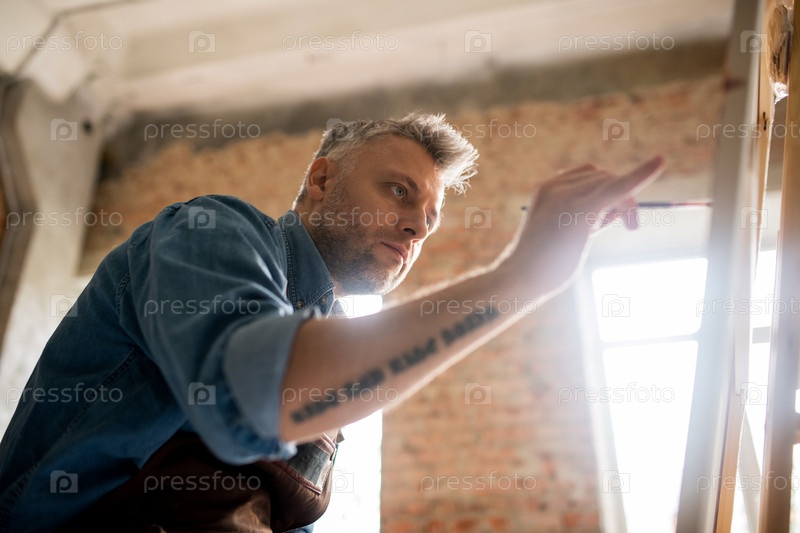 Серьезный и внимательный художник средних лет, работающий над новой картиной