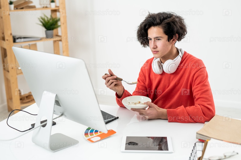 Серьезный фрилансер ест мюсли с молоком у стола перед монитором компьютера