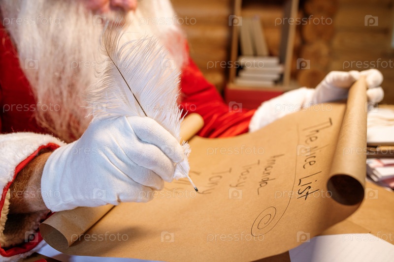 Перчатковая рука Санты, держащей белое перо над красивым списком на развернутой бумаге