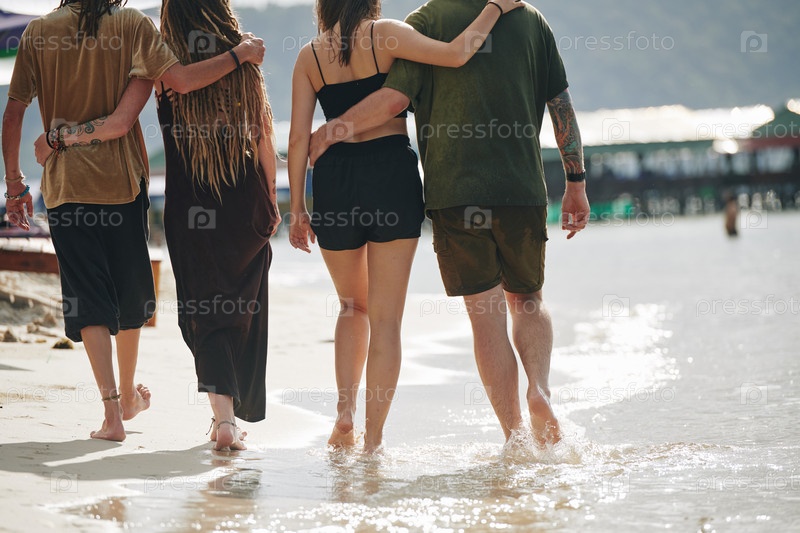 Пары, гуляющие вдоль песчаного пляжа