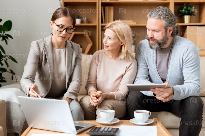 Уверенный агент по недвижимости делает презентацию зрелой паре на встрече