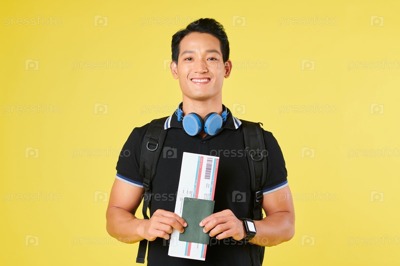 Счастливый турист с рюкзаком и билетом на самолет