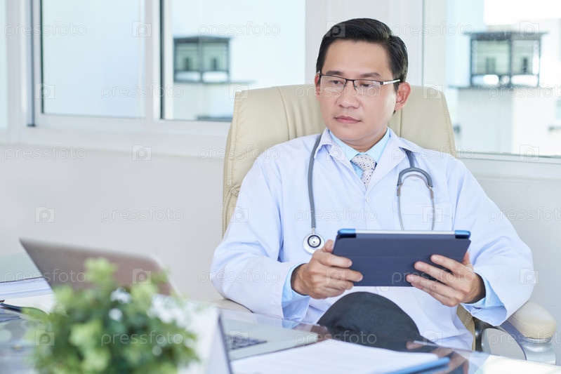 Доктор работает над цифровым планшетом