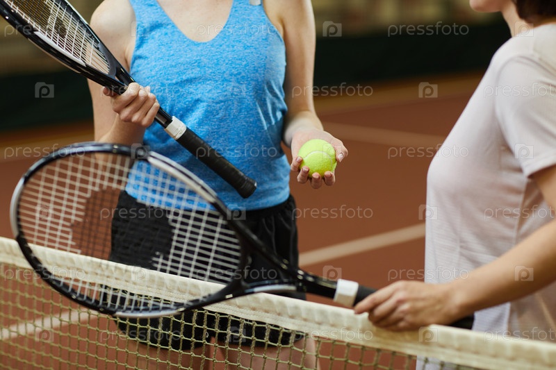 Близкий план неузнаваемых женщин с ракетками, стоящих у теннисной сети и выбирающих, кто будет бросать мяч