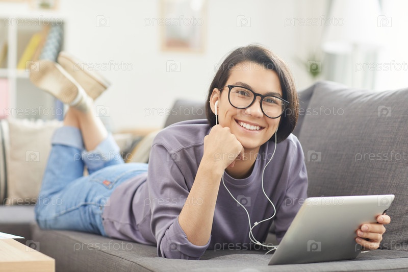 Портрет веселой красивой девушки с короткими волосами, лежащей на диване в гостиной и использующей планшет для онлайн-образования