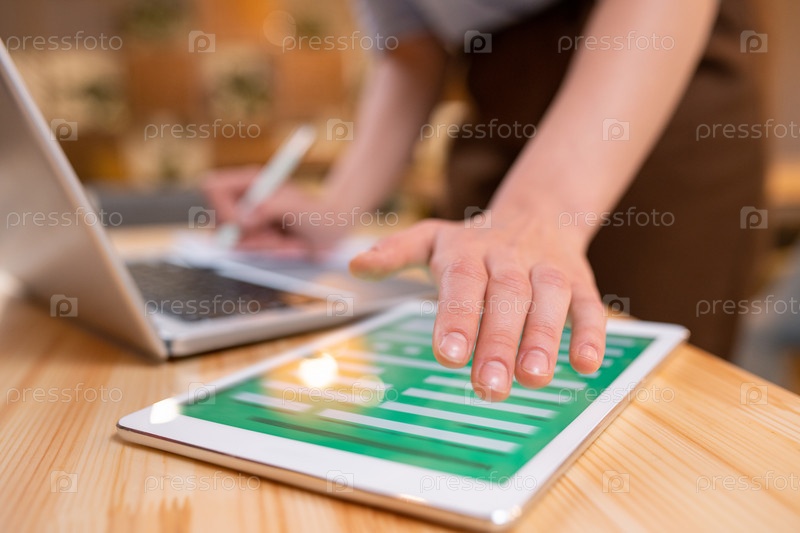 Рука молодой современной деловой женщины на цифровом планшете