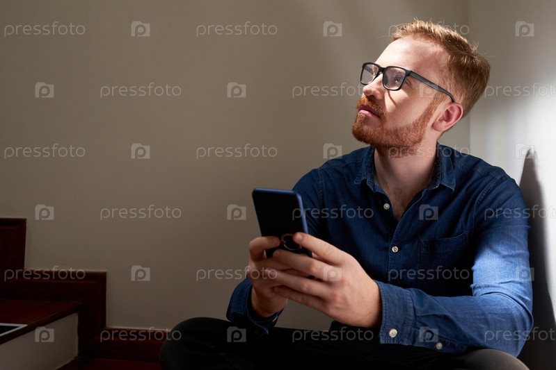 Вдумчивый мужчина с мобильным телефоном